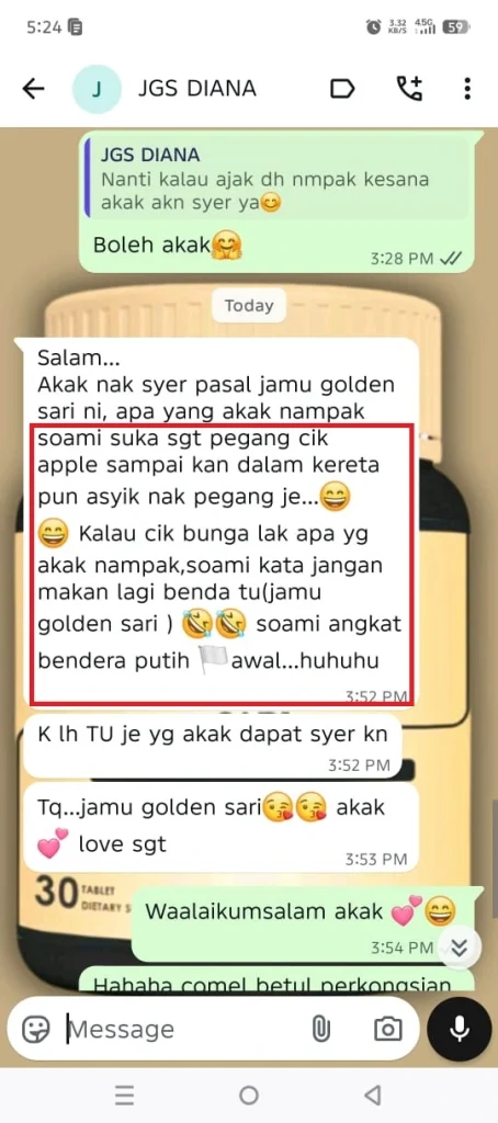 Kalau perasan mostly yang ambil jamu golden sari ni baru 1 ke 2 minggu tapi dah nampak hasil. Antaranya sebab bahan yang bergred tinggi dan kaedah penggunaan kemam bawah lidah yang 10x ganda lebih cepat. Sebab tu kena berani IKHTIAR kalau taknak hadap aset tu kendur .